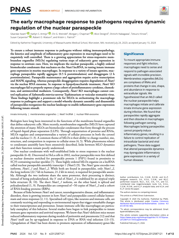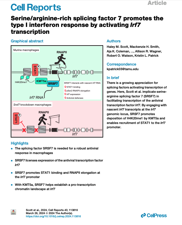 The Patrick lab studies the contributions of RNA binding proteins to macrophage activation and how post-transcriptional regulation of innate immune gene expression (mostly at the level of pre-mRNA splicing) impacts infection outcomes.