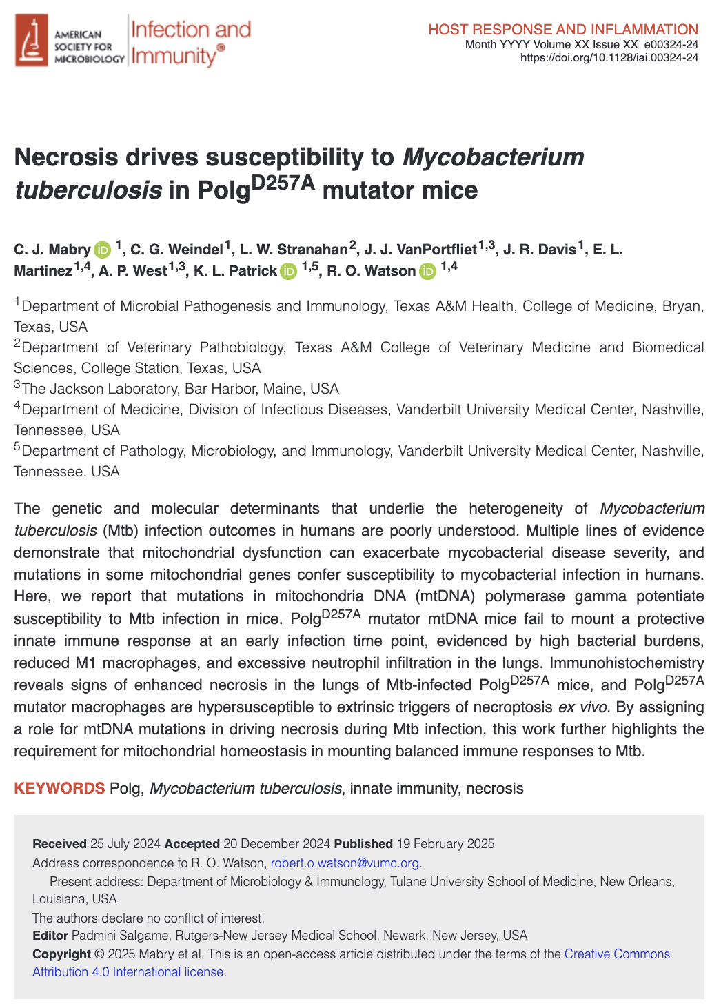 March 2025: Congrats to Cory Mabry on his first first-author paper on Mtb susceptibility in Polg mutator mice